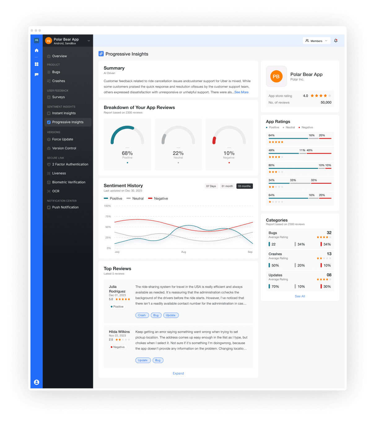 Sentiment Insights processes user feedback with advanced algorithms for insightful summaries and sentiment analysis. Get instant insights from app URLs, progressive insights via API integration. Categorize feedback, highlight top reviews, summarize app store comments, and track user ratings for betterment.